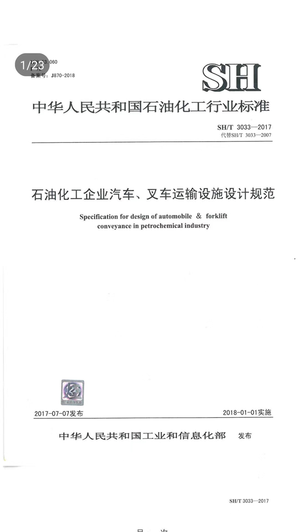 由中華人民共和國工業(yè)和信息化部發(fā)布的《中華人民共和國石油化工行業(yè)標準》中的《石油化工企業(yè)汽車、叉車運輸設施設計規(guī)范》(以下簡稱:規(guī)范)于2018101日正式實施。