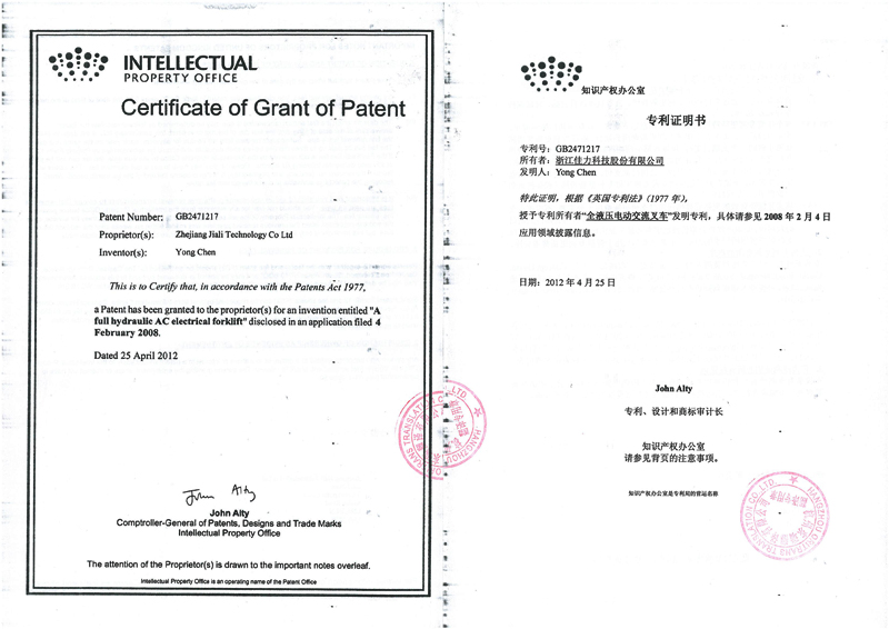 全液壓電動交流叉車獲得國際發(fā)明專利
