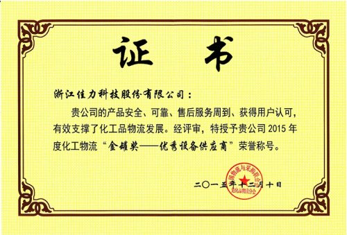 2015年12月10日-11日,由中國物流與采購聯(lián)合會?;肺锪鞣謺鬓k的“2015全國化工物流行業(yè)年會”在寧波召開。圍繞行業(yè)現(xiàn)狀、趨勢及未來機遇,會議全面探討了化工物流的發(fā)展、變革與創(chuàng)新,并舉行了“2015中國化工物流金罐獎”的評選。在年度企業(yè)評選中,浙江佳力科技股份有限公司作為設(shè)備供應(yīng)商榮膺“金罐獎——優(yōu)秀設(shè)備供應(yīng)商”稱號。