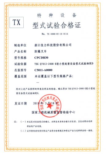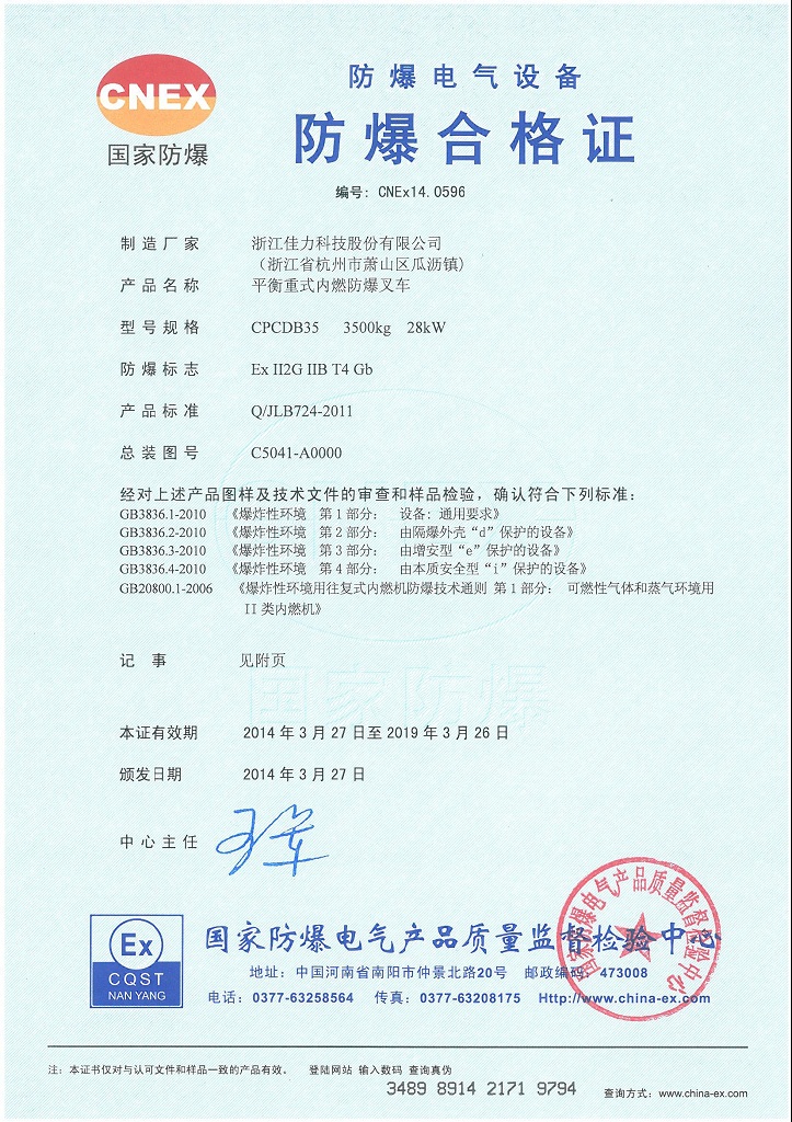 型 號 | 單位 | CPCD20 | CPCD25 | CPCD30 | CPCD35 | 額定起重量 | kg | 2000 | 2500 | 3000 | 3500 | 載荷中心距 | mm | 500 | 最大起升高度 | mm | 3000 | 門架傾角(前/后) | ° | 5/11 | 滿載最大行駛速度 | km/h | 17 | 最小轉(zhuǎn)彎半徑 | mm | 2250 | 2350 | 滿載爬坡度 | % | 20 | 18 | 外型尺寸 | 長 | mm | 3678 | 3808 | 寬 | 1295 | 高 | 2180 | 自重 | kg | 4200 | 4450 | 4510 | 4750 | 取得認(rèn)證 | - | 型式試驗認(rèn)證、防爆認(rèn)證、CE認(rèn)證 | 防爆標(biāo)志 | - | ExⅡ2G ⅡBT4/ DIP A21 TA,T4 | 適用防爆區(qū)域 | - | 1區(qū)、2區(qū)和21區(qū)、22區(qū) | 爆炸性氣體組別 | - | IIB | 溫度級別 | - | 135?C (T4) | 認(rèn)證機構(gòu) | - | 國家防爆電氣產(chǎn)品質(zhì)量監(jiān)督檢驗中心(中國南陽) |