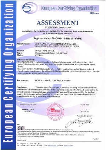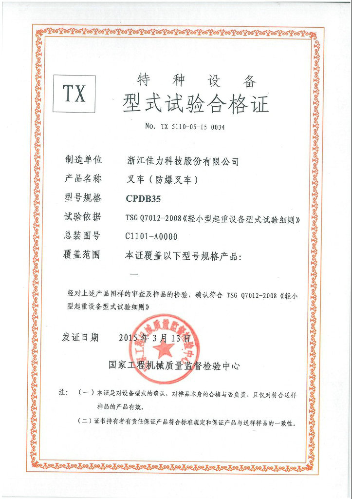 型 號(hào) | 單位 | CPDB20 | CPDB25 | CPDB30 | CPDB35 | 額定起重量 | kg | 2000 | 2500 | 3000 | 3500 | 載荷中心距 | mm | 500 | 最大起升高度 | mm | 3000 | 門架傾角(前/后) | ° | 6/12 | 最小轉(zhuǎn)彎半徑 | mm | 2110 | 2270 | 滿載爬坡度 | % | 15 | 13 | 外型尺寸 | 長(zhǎng) | mm | 3435 | 3605 | 寬 | 1200 | 1250 | 高 | 2150 | 2160 | 2170 | 自重 | kg | 4000 | 4600 | 4870 | 5050 | 取得認(rèn)證 | - | 型式試驗(yàn)認(rèn)證、防爆認(rèn)證、CE認(rèn)證 | 防爆標(biāo)志 | - | Ex desⅡBT4/Ex tD A21 IP65 T130℃ | 適用防爆區(qū)域 | - | 1區(qū)、2區(qū)和21區(qū)、22區(qū) | 爆炸性氣體組別 | - | IIB | 溫度級(jí)別 | - | 135?C (T4) | 認(rèn)證機(jī)構(gòu) | - | 國(guó)家防爆電氣產(chǎn)品質(zhì)量監(jiān)督檢驗(yàn)中心(中國(guó)南陽(yáng)) |